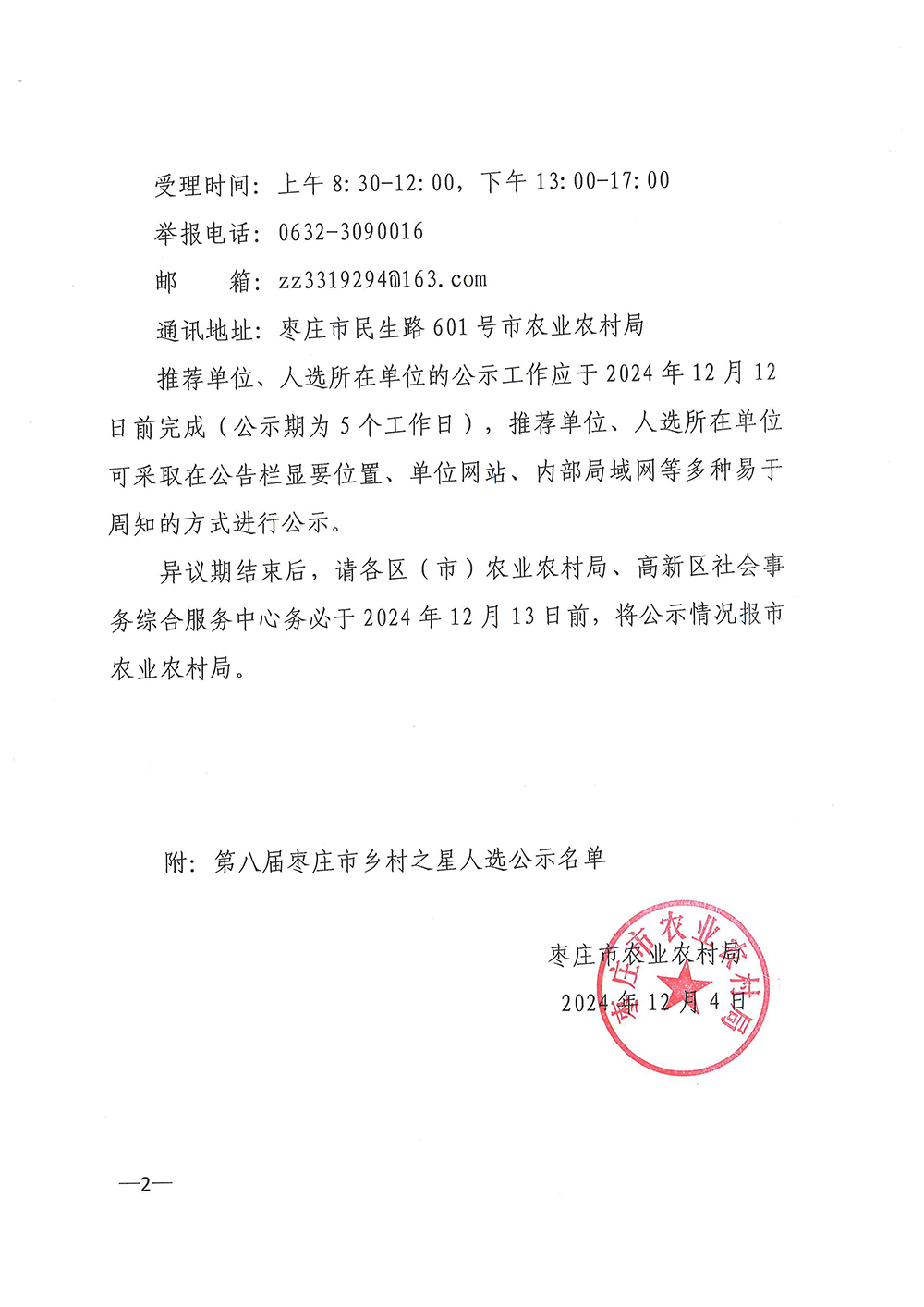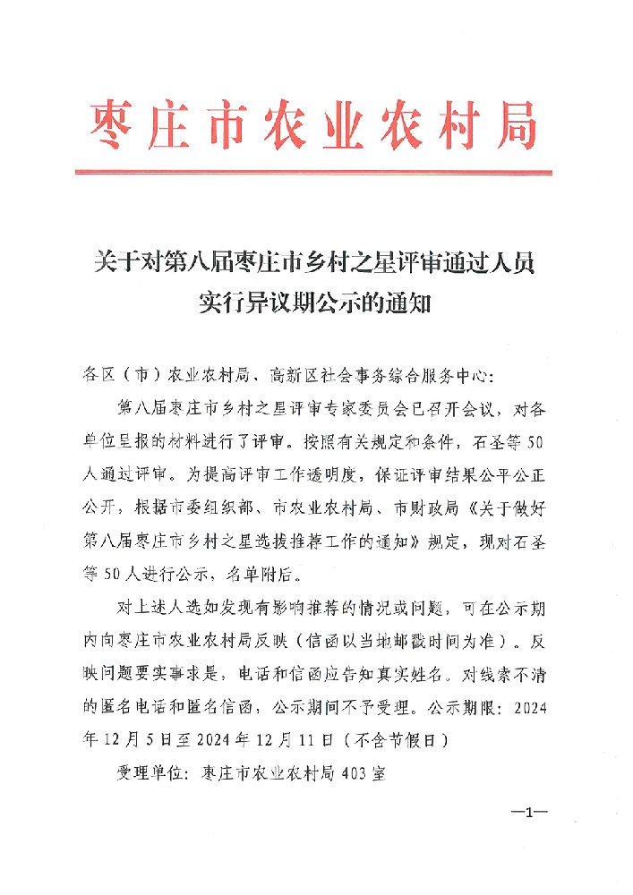 关于对第八届枣庄市乡村之星评审通过人员实行异议期公示的通知